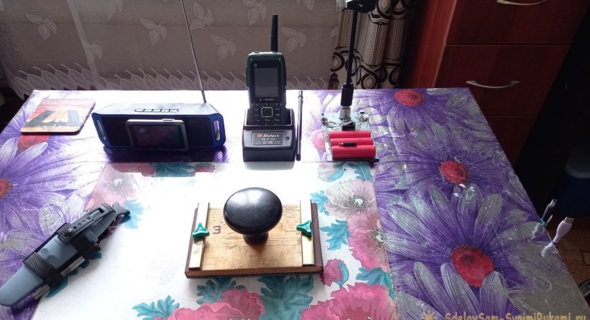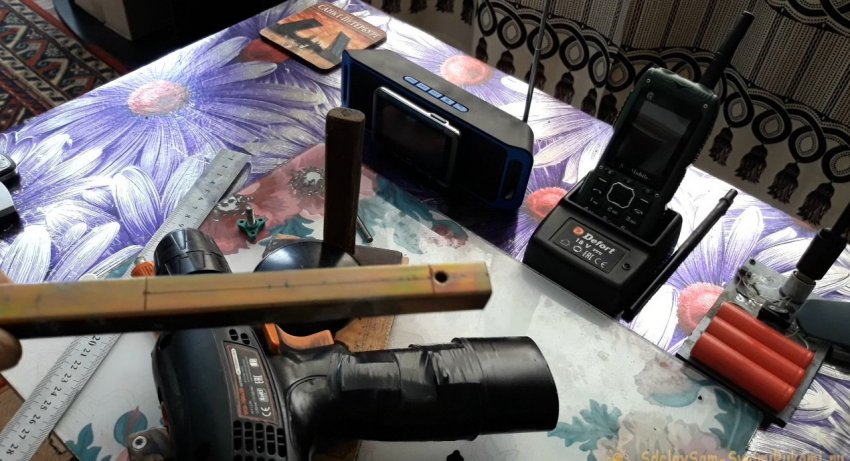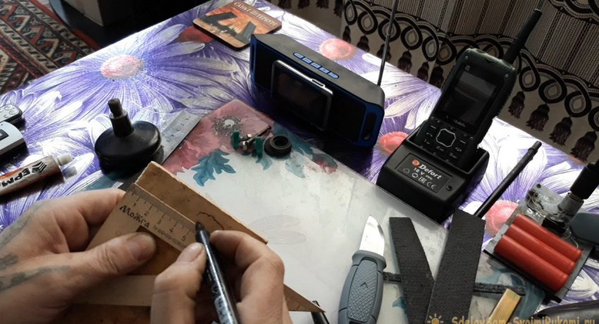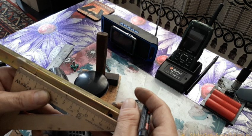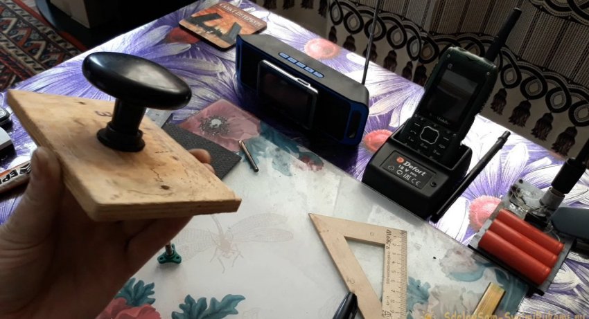 Теперь надо приладить рукоятку. Я для этой цели взял текстолитовую рукоятку с винтовой резьбой на 10 мм. Мне она показалась наиболее удобной для инструмента такого типа. Если такой рукоятки не найдётся, можно взять и обычную ручку от двери. Итак, с помощью линейки и маркера, вычисляем центр на заготовке и сверлим в ней отверстие для резьбы рукоятки.