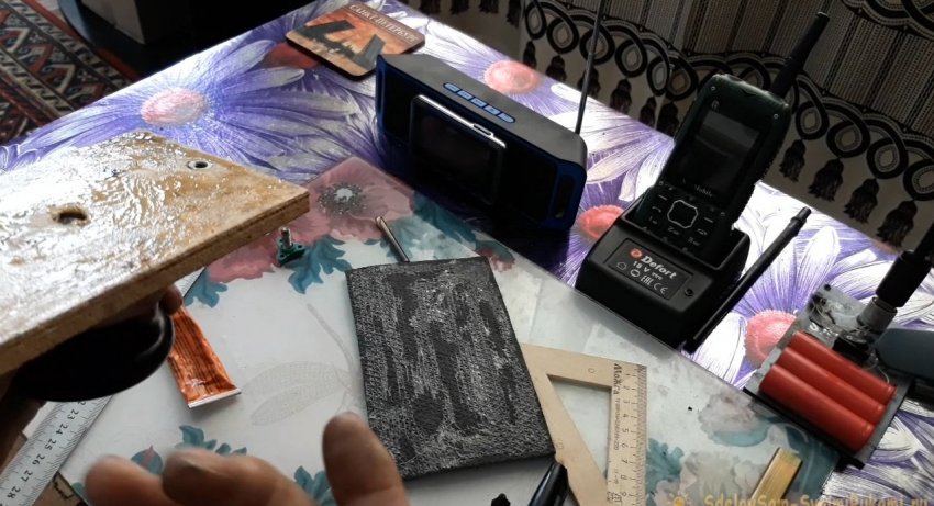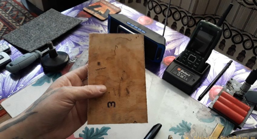 Для начала изготовим основу. Для неё идеально подойдёт фанера, толщиной в десять миллиметров. Если не нашлось фанеры, можно использовать любую струганную доску. Вырезаем из фанеры прямоугольник 10 на 15 мм.