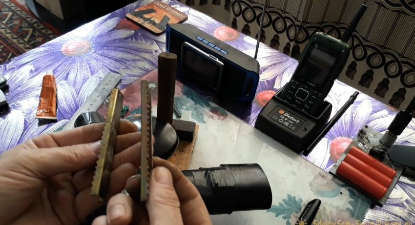 Далее нужно распустить отрезок на две равные продольные половины. На одной из сторон каждой половинки можно нарезать зубья, для лучшего захвата наждачной бумаги.