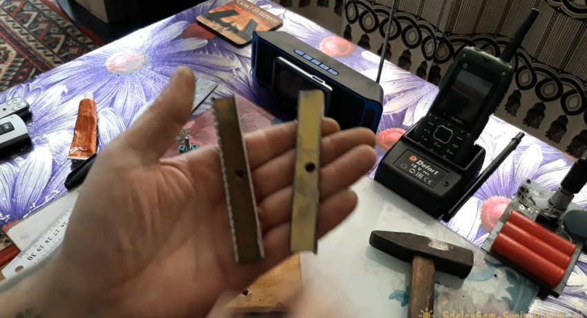 Определяем на каждой половине центр, и сверлим там отверстия на 5 мм, для резьбы барашков. Отверстия лучше сверлить как можно дальше от зубастой стороны. Вот так: