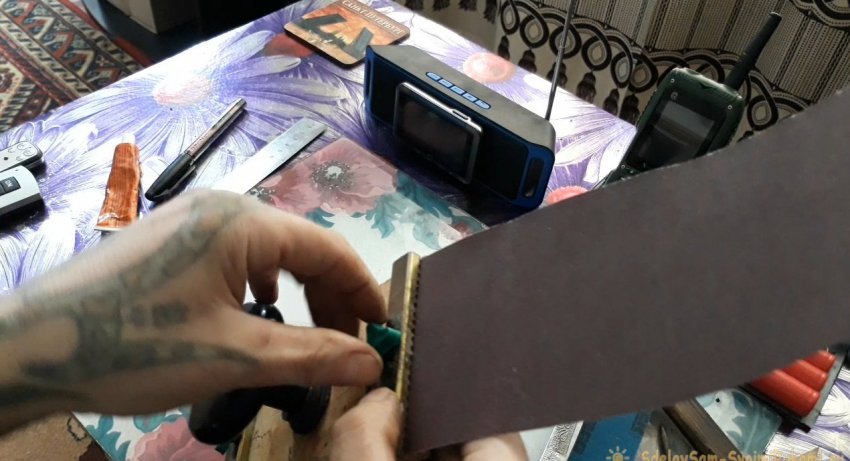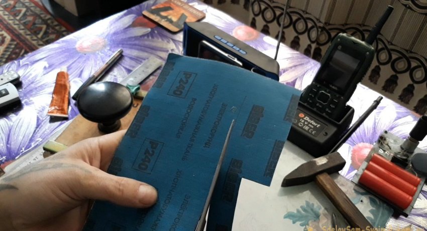 Ну вот, инструмент готов. Осталось установить наждачную бумагу, нужной зернистости. Отрезаем кусок наждачной бумаги соответствующей ширины.