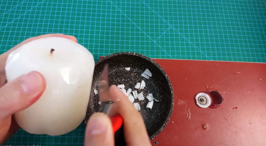 Парафин разогреваем в подходящей ёмкости. Для этого используем строительный фен. Аккуратно заливаем расплав в изготовленную форму. Тонкой проволокой равномерно распределяем его, чтобы парафин проник внутрь зубьев шестерни. И ждём застывания.