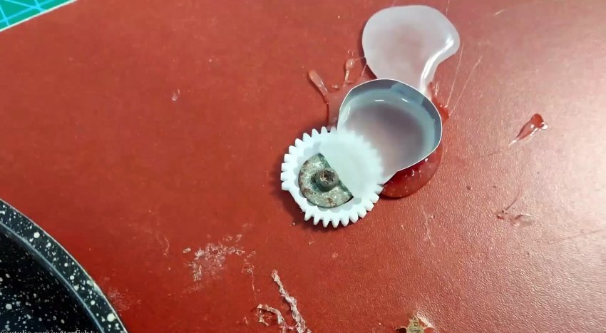 Готовим эпоксидный состав. Наносим его на парафиновую форму. Внимательно и тщательно следим, чтобы смола попала внутрь каждого зуба нашей формы. Далее, соединяем поврежденную шестерню с изготовленной нами парафиновой матрицей.
