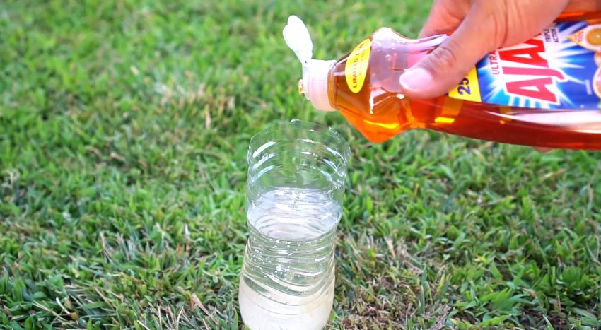 В бутылку следует залить полстакана уксуса, добавить 2 столовые ложки сахара и 1 столовую ложку средства для мытья посуды. Смесь тщательно перемешивается.