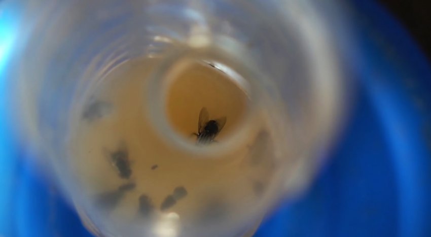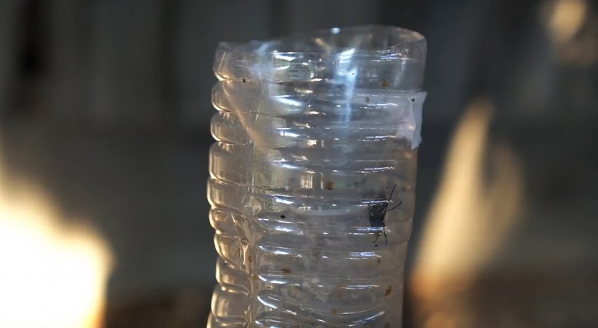 Сверху закрыть отрезанной верхней частью бутылки, перевернув её и свинтив крышку. Именно в отверстие, ранее закрытое крышкой, и будут попадать в ловушку насекомые. Результат не заставит себя долго ждать. Мухи, попадающие в бутылку через горлышко, уже не могут выбраться из ловушки.