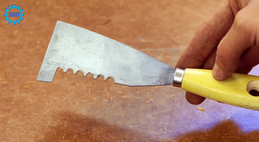 С одного бока рабочей части металлического шпателя вырезаем площадку, параллельную продольной оси инструмента, но не до конца. На площадке выполняем несколько полукруглых выемок на равном расстоянии. Теперь измененной стороной шпателя можно равномерно распределять по ровной поверхности клей, силикон и другие подобные вещества.