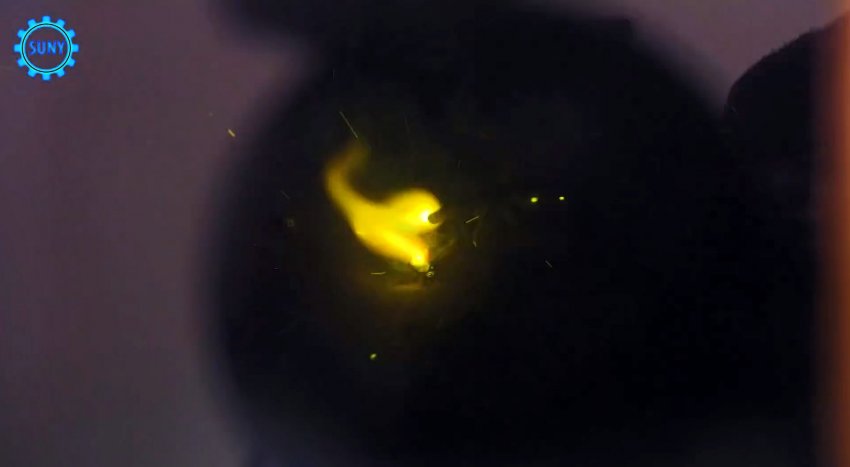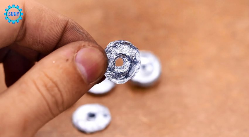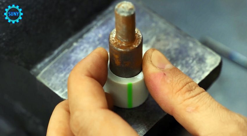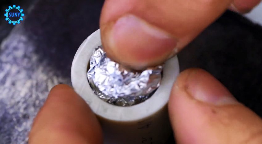 От толстостенной пластиковой трубы отрезаем небольшой фрагмент и, периодически помещая внутрь скомканную алюминиевую фольгу, уплотняем с помощью двухступенчатого цилиндра, диаметр нижней части которого в точности соответствует внутреннему диаметру трубного фрагмента. На поверхность уплотненной фольги укладываем шайбу того же диаметра и повторяем уплотнение. Удаляем шайбу и в уплотненной фольге по центру сверлим дрелью отверстие.