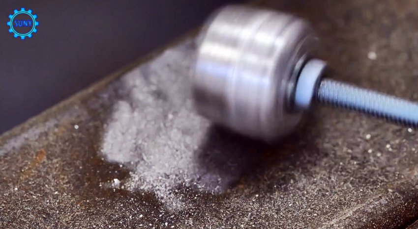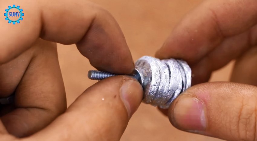 Затем уплотненные кольца фольги нанизываем на винт и через небольшую шайбу затягиваем гайкой. Вставляем стержень винта в дрель и полученным инструментом очищаем металлические поверхности.