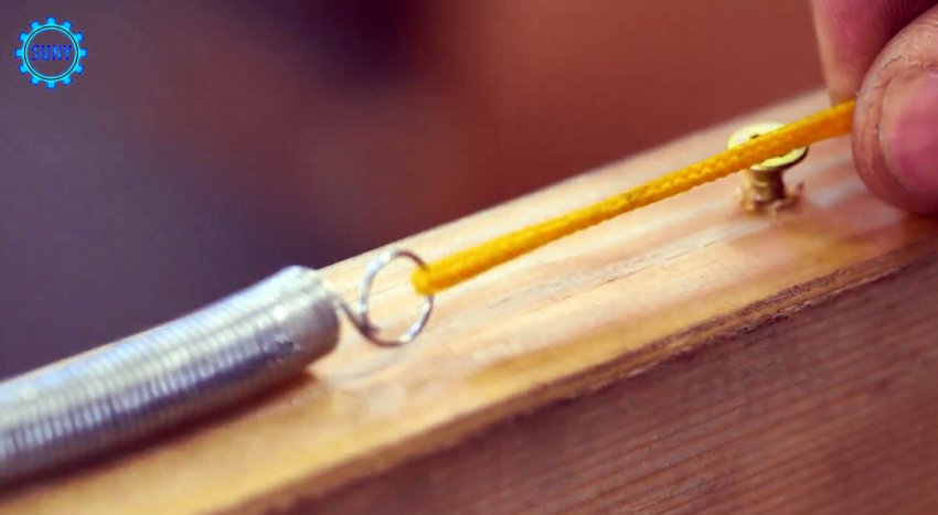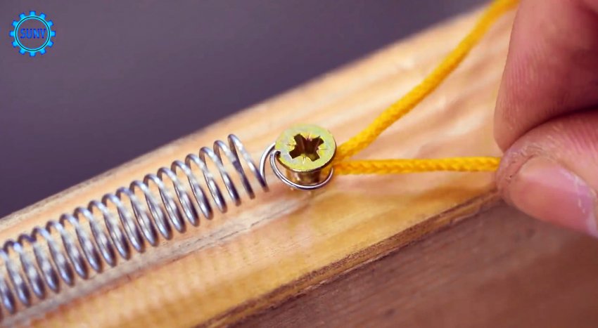 Закрепить одну сторону пружины растяжения не представляет труда, а вот повторить то же самое с другой стороны голыми руками затруднительно. Если через полукольцо пропустить шнур или прочную нить, то потянув за нее, зацеп осуществить очень легко.