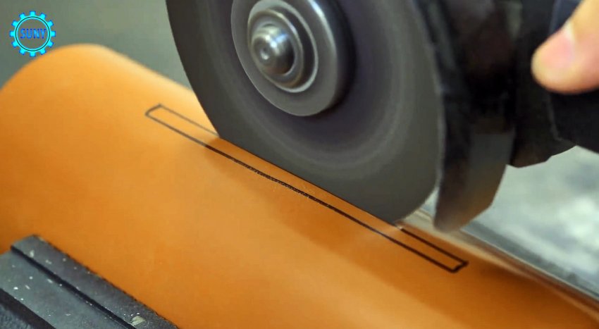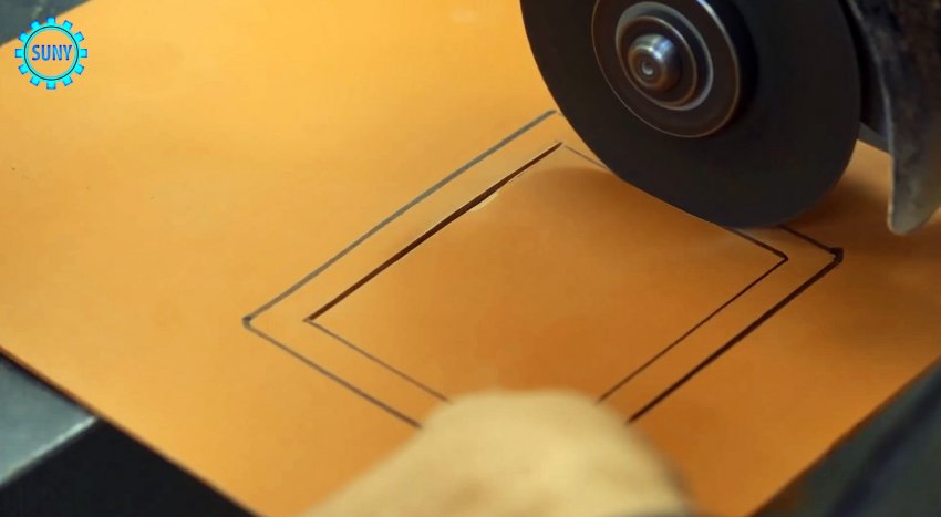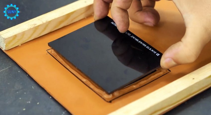 Укладываем на нее сварочный светофильтр и переносим контур на пластину ПВХ. Внутри полученного контура чертим подобный, но поменьше и вырезаем его болгаркой.