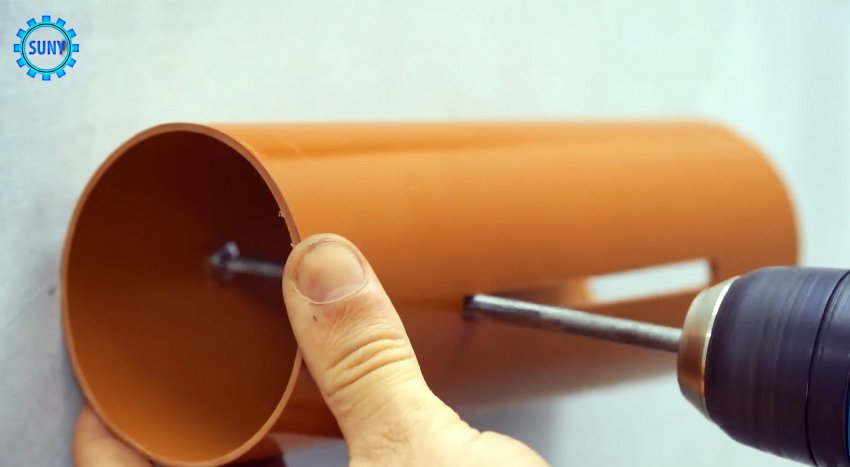 На боковой поверхности куска трубы ПВХ вырезаем продолговатую прорезь. На противоположной стороне напротив прорези сверлим два отверстия и крепим изделие шурупами или саморезами к стене.