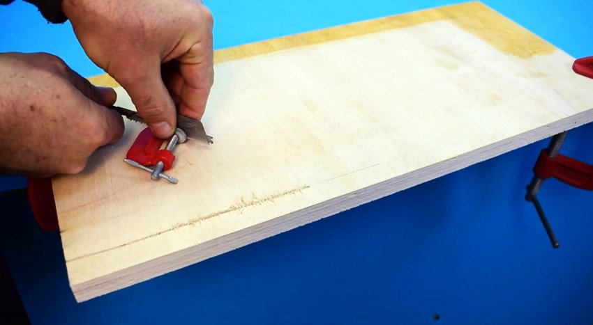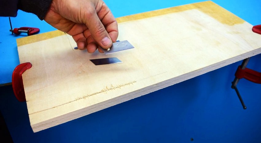 Чтобы их не было, нужно сделать простенькое приспособление. Возьмите два лезвия от монтажного ножа, и уложите между ними пилочку для лобзика. Затем сожмите это все струбциной.