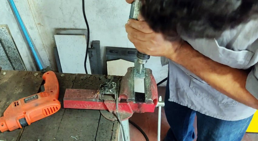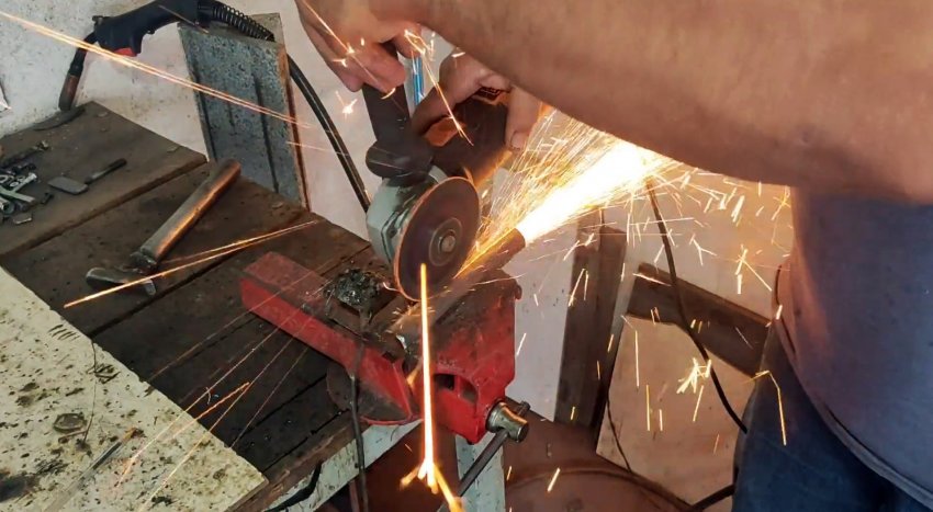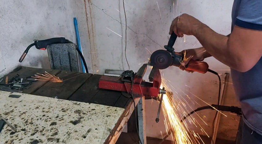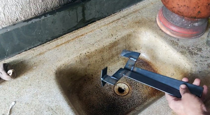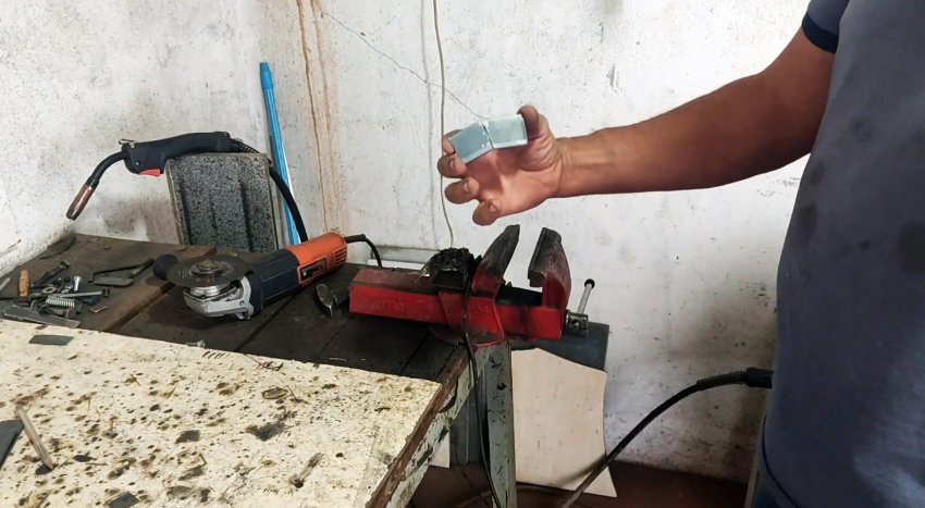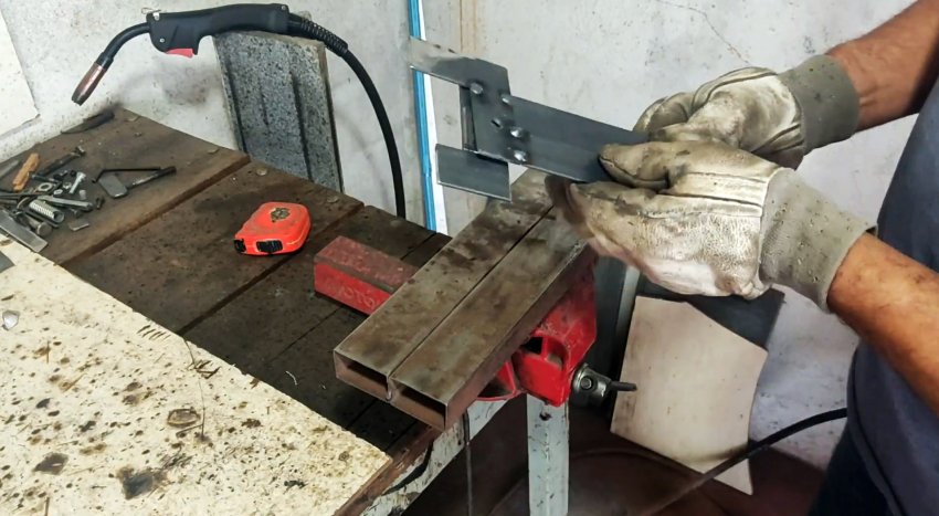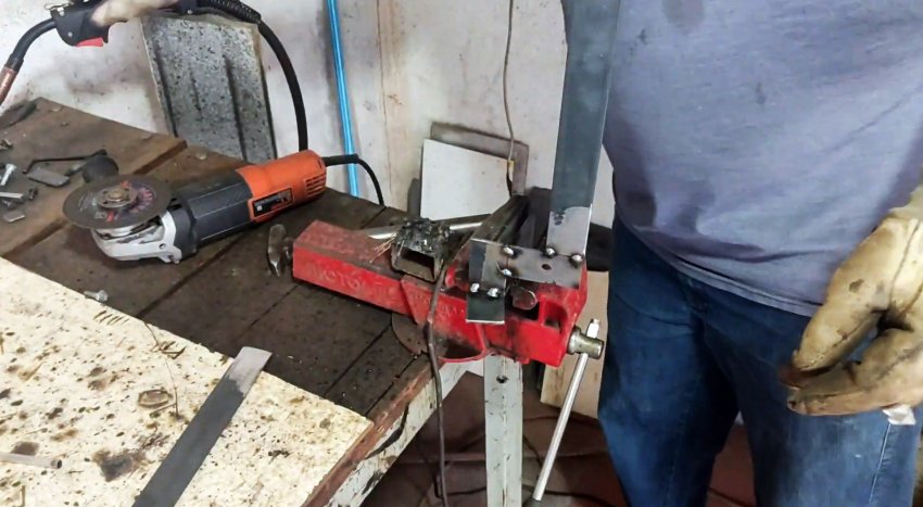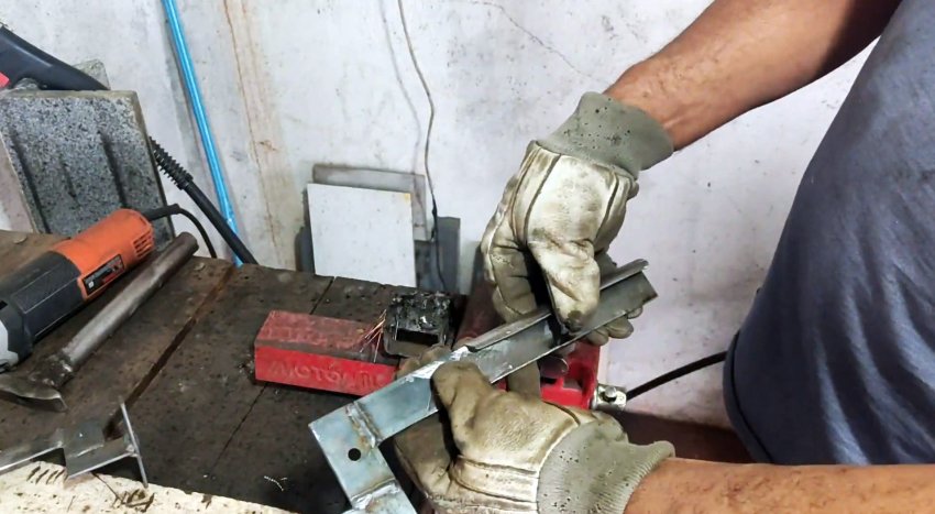В одной из оставшейся короткой пластине в центре вырезаем болгаркой V-образный паз глубиной примерно на 3/4 ее ширины. Используя выполненный паз, сгибаем пластину в ее плоскости. Привариваем изогнутою заготовку по линии изгиба поперечно к торцу вертикальной короткой пластины.