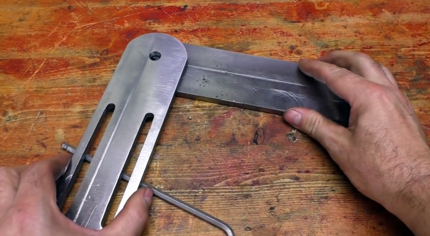 Перед использованием требуется настроить нужный угол между пластинами. Затем к швеллеру прикладывается труба и поджимается струбциной. После этого она просверливается коронкой. Важно, чтобы диаметр последней был равен трубе.