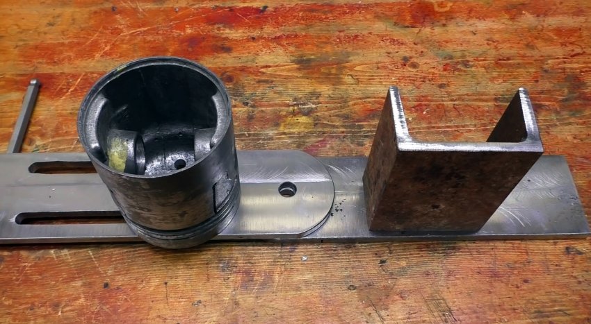 Далее нужно подготовить отрезок швеллера длиной 100 мм. Он устанавливается на целую пластину. Сверху на нее укладывается деталь с пазами, а затем поршень. Это нужно, чтобы точно разметить центр штока на швеллере.