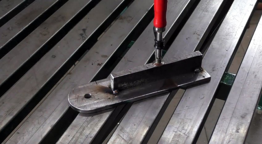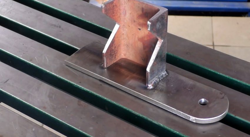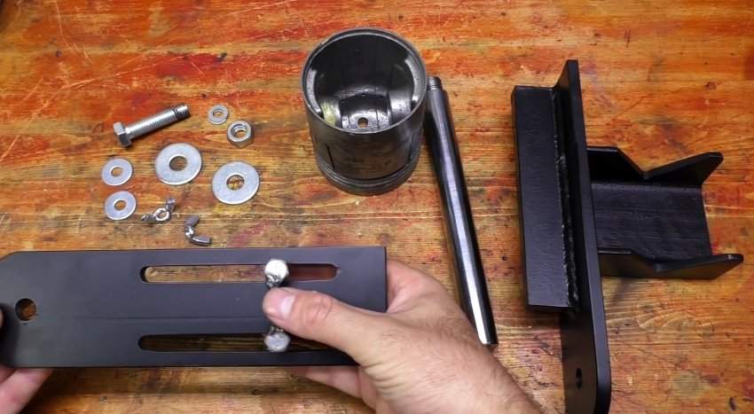 К пластине без пазов приваривается гребень из полосы, чтобы зажимать ее в тисках. На обратной стороне следует приварить швеллер. Также нужно будет сделать скобу из двух болтов и перемычки, чтобы прикручивать поршень к пластине с пазами.