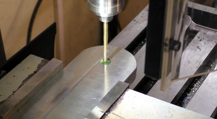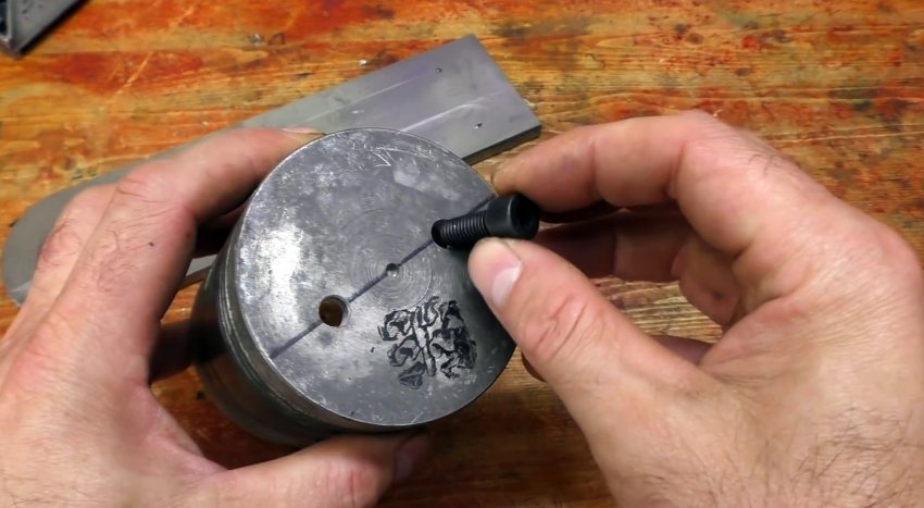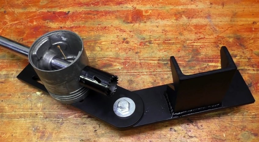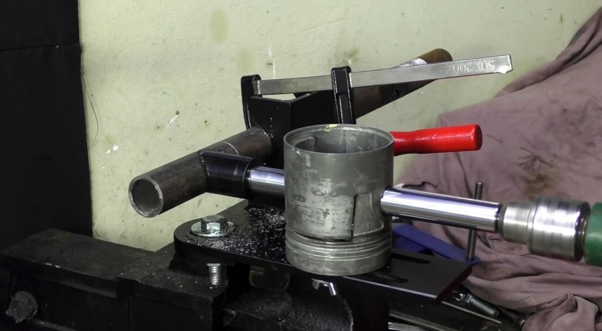 Далее пластины скручиваются между собой болтом. Затем прикручивается поршень, вставляется шток, на него наворачивается коронка, и инструмент зажимается в тисках.