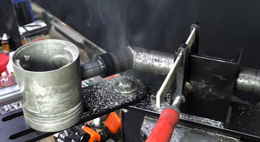В днище поршня по разделяющей его пополам линии просверливается 2 отверстия 8 мм с отступом 40 мм.
