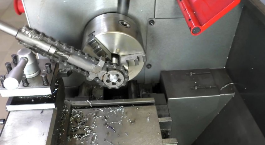 На торце штока нарезается резьба под коронку по металлу. Второй его край нужно сточить до диаметра 10 мм. Это нужно, чтобы зажимать шток в патроне дрели.