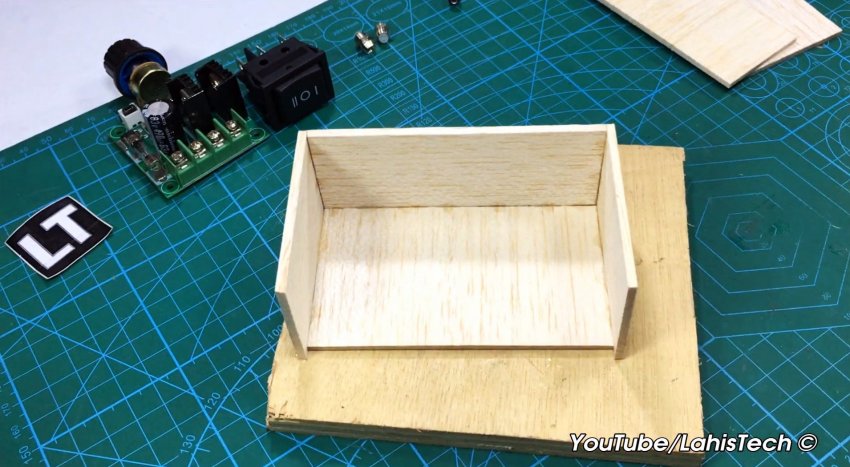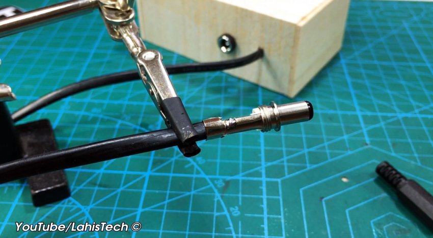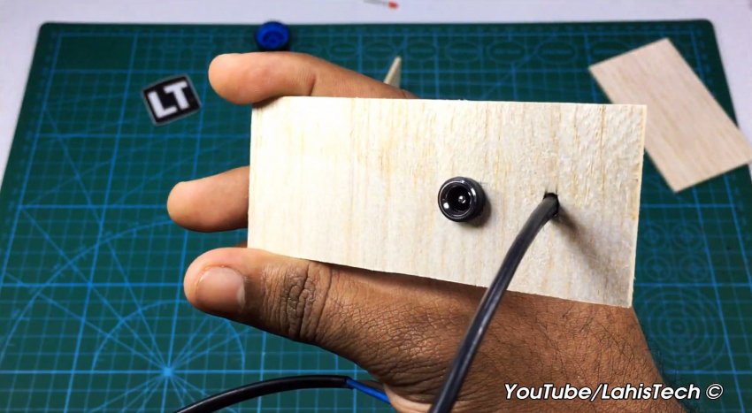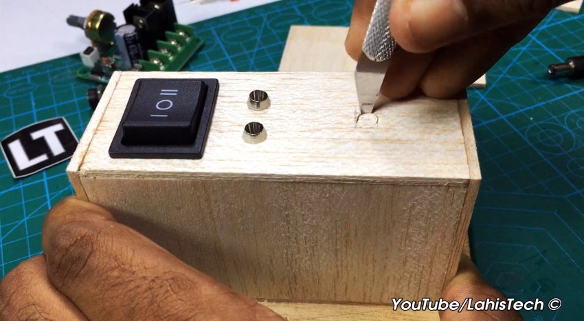 На задней стенке делаем прорезь под провод и гнездо питания.