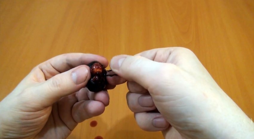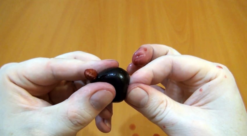 А удалить косточку несложно. Просто вставляем ее в плод и косточка выходит с другой стороны.