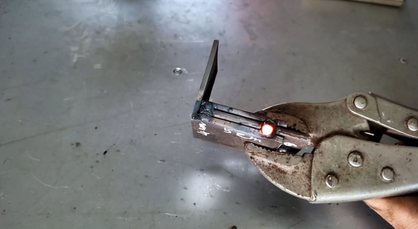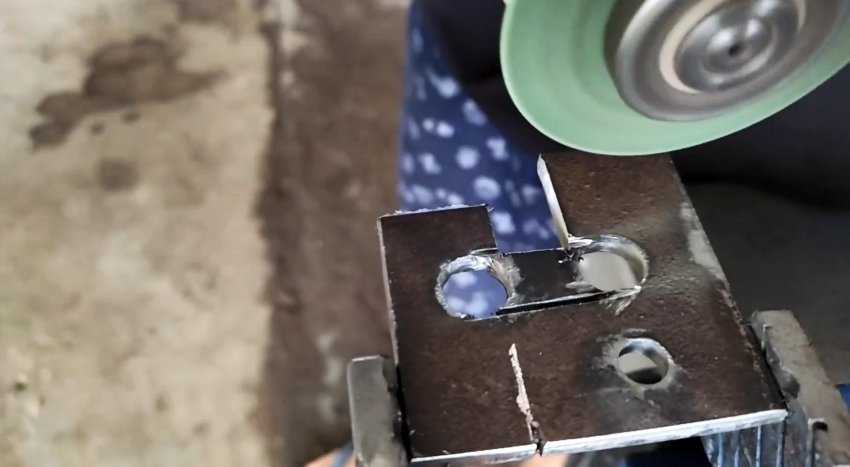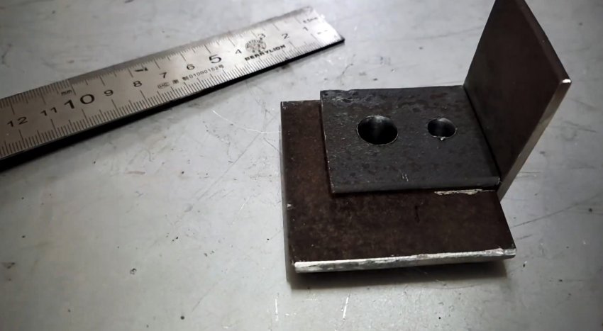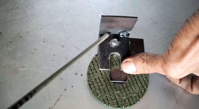 Между пластиной и квадратом вставляем остаток отрезного диска от болгарки. Прижимая пластину к отрезному диску, привариваем пластину к полке уголка. Убираем диск и получаем зазор между пластиной и квадратом.