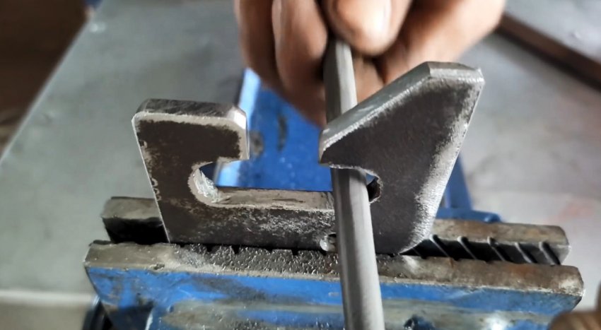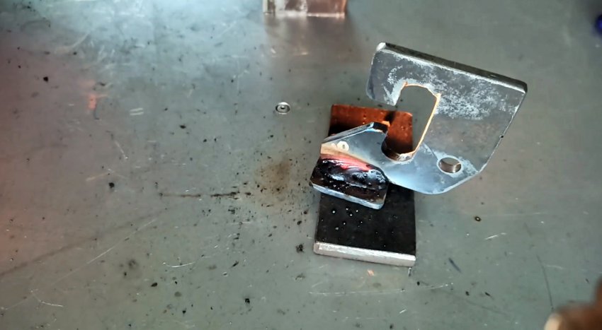 Привариваем к фигуре, полученной из квадрата, снизу под «язычком» будущей защелки симметрично маленький квадрат из плоского листа, выполнив фаски под сварочные швы.