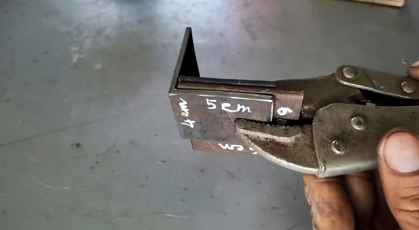 На внутреннюю полку уголка укладываем квадрат, а на него – фрагмент полосы. Выравниваем стороны деталей по краю полки уголка, фиксируем клещами-струбциной и прихватываем в двух местах сваркой.
