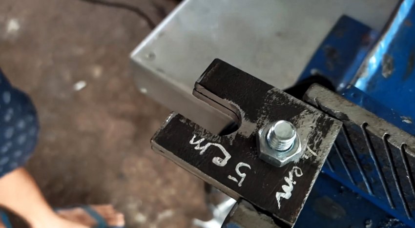Удаляем прихватки и разделяем детали «пирога». Уголок и полосу стягиваем с помощью болта и гайки по меньшему отверстию. К большему отверстию выполняем прорезь, равную его диаметру от края полки уголка и полосы.