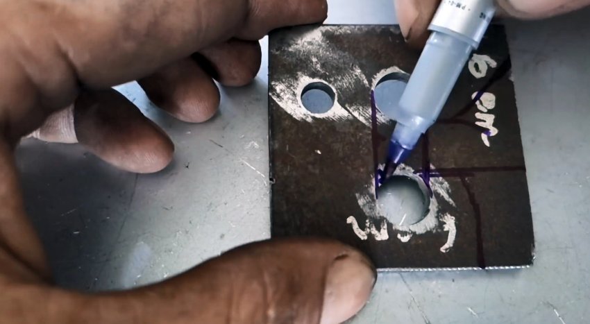 В малое сквозное отверстие вставляем стальной стержень со стороны полки уголка и заподлицо с поверхностью пластины. Выступающий из уголка стержень срезаем и привариваем остаток к полке уголка снаружи и зашлифовываем место сварки.