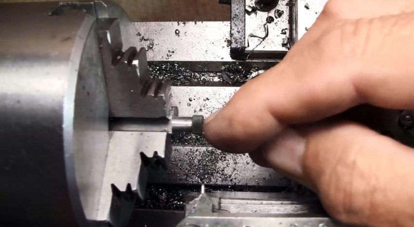 Перед ним вытачивается канавка под стопорное колечко. После этого надевается ролик, и стопорится колечком из проволоки.