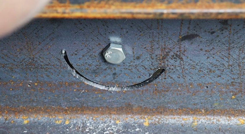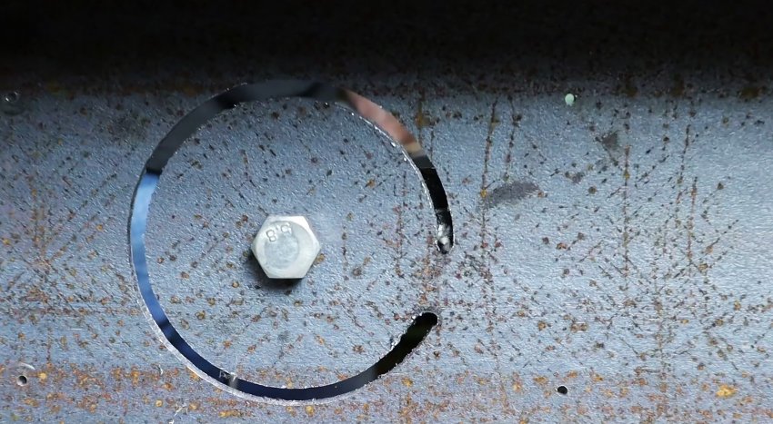 Устройство для резки готово. Поверхность швеллера смазываем средством для уменьшения трения (можно использовать обычное сало). Одного качественного шурупа хватает на прорезание полукруга диаметром 100 мм. Важно использовать качественные саморезы, ведь дешевого хватит только на расстояние около 20 мм.