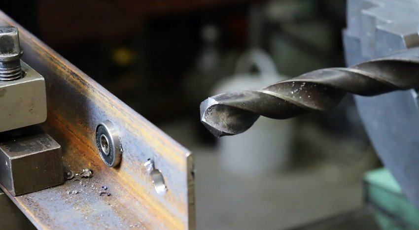 В отверстие с подшипником вставляем изготовленную из шестигранника деталь. Через детальку из шестигранника просверливаем отверстие – это будет стартовая точка для резки саморезом. Далее вставляем саморез и зажимаем. Саморез будет работать как фреза.