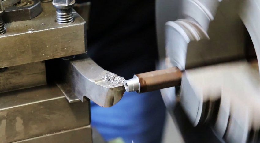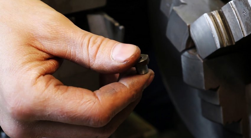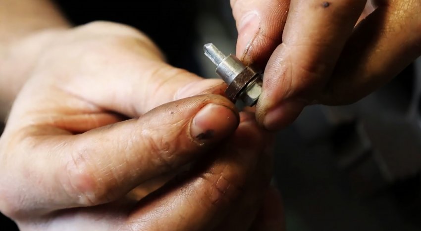 Из шестигранника на 12 сделаем небольшую, но важную деталь. Просверлим внутри шестигранника отверстие, в которое будет вкручиваться саморез. Округляем примерно 1 см от края шестигранника, еще 0,5 см оставляем как есть. Отрезаем деталь от тела шестигранника.