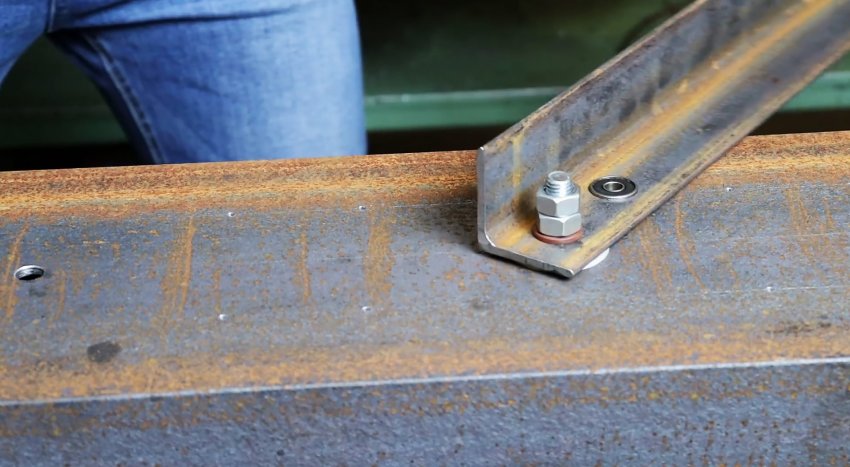 Далее фиксируем швеллер ребрами вниз на ровной поверхности. В отверстие в швеллере вставляем болт. Сверху на болт надеваем фторопластовую шайбу и уголок крайним отверстием. Затем капроновую шайбу и зажимаем двумя гайками, одна из которых будет выполнять функцию контргайки.