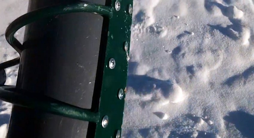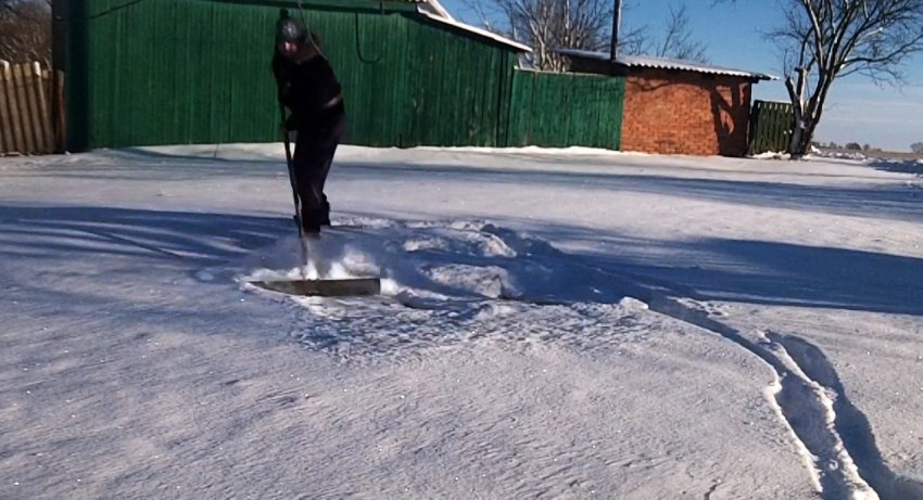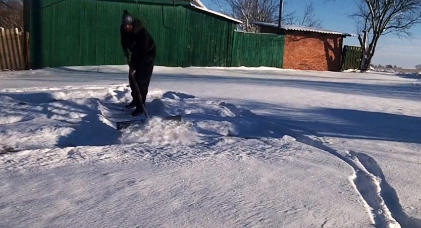 Самодельные грабли легко захватывают рыхлый или слегка утрамбованный снег высотой до 10 см. Ими очень удобно продвигаться параллельно сбоку дорожки, и расчищать ее возвратно-поступательными движениями. Производительность при таком методе получается практически как у мини снегоуборщика.