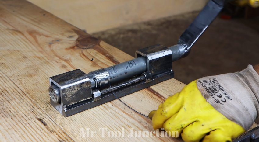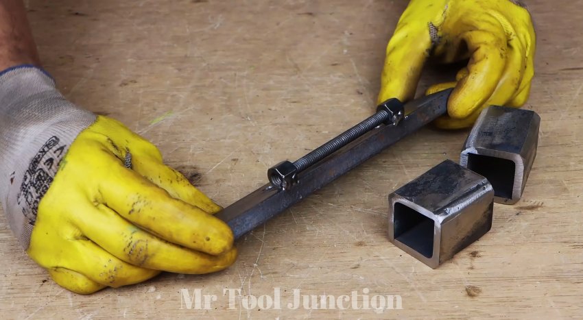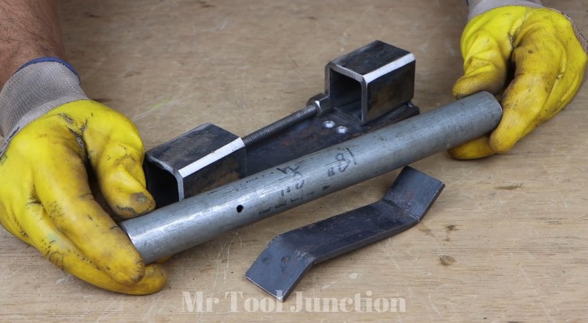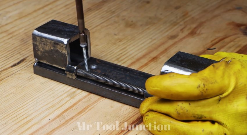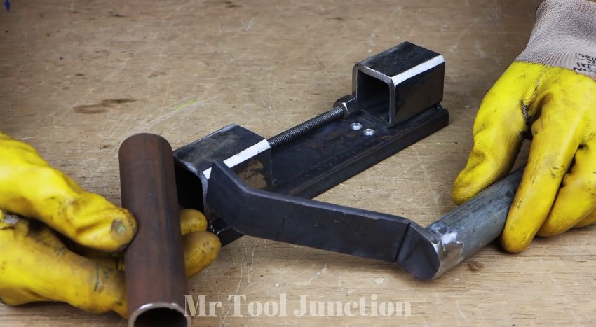 Пластину с двумя приваренными квадратами и шпилькой надежно прикручиваем шурупами к деревянному основанию. Помещаем внутрь квадратов трубу с отверстием в стенке. Теперь приспособление полностью готово к работе.