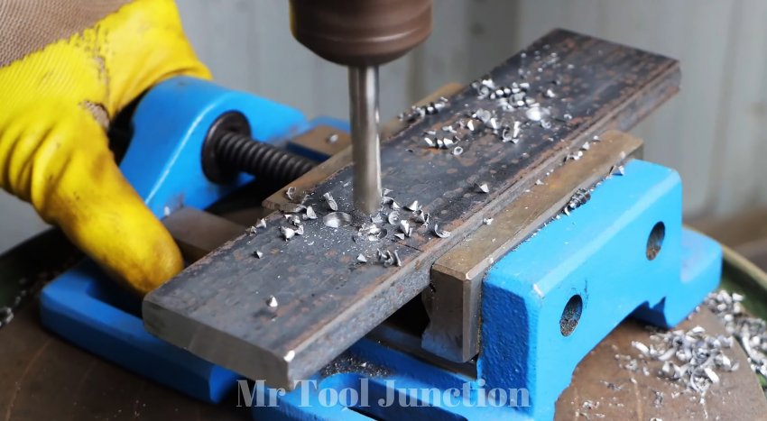 Отрезаем от стальной полосы достаточной толщины необходимый по длине отрезок. Выполняем на нем разметку для четырех симметрично расположенных попарно отверстий на некотором расстоянии друг от друга и сверлим их на сверлильном станке. С одной стороны отверстия рассверливаем под головки шурупов.