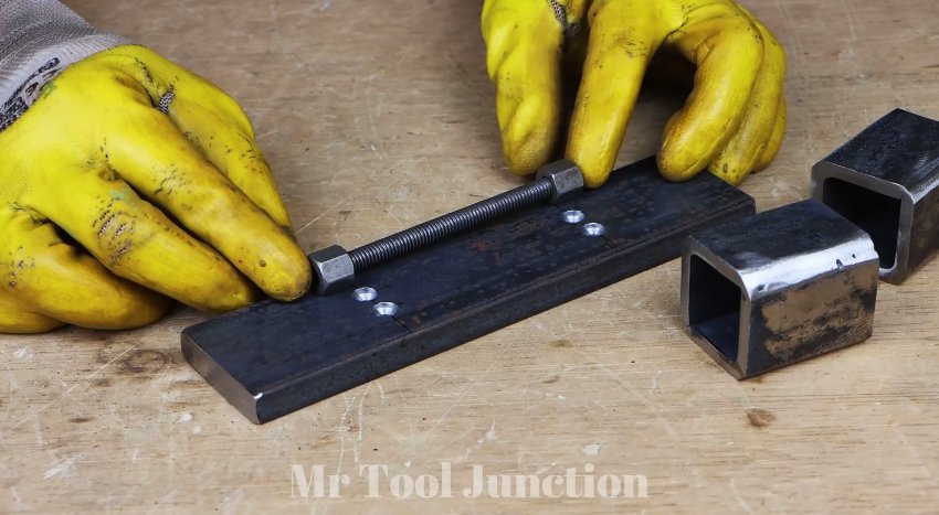 На шпильку требуемой длины накручиваем с двух сторон высокие гайки и привариваем их симметрично в продольном направлении к одной из длинных кромок пластины и зачищаем сварочные швы.