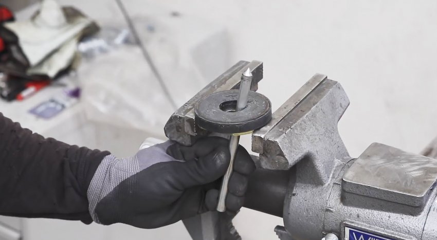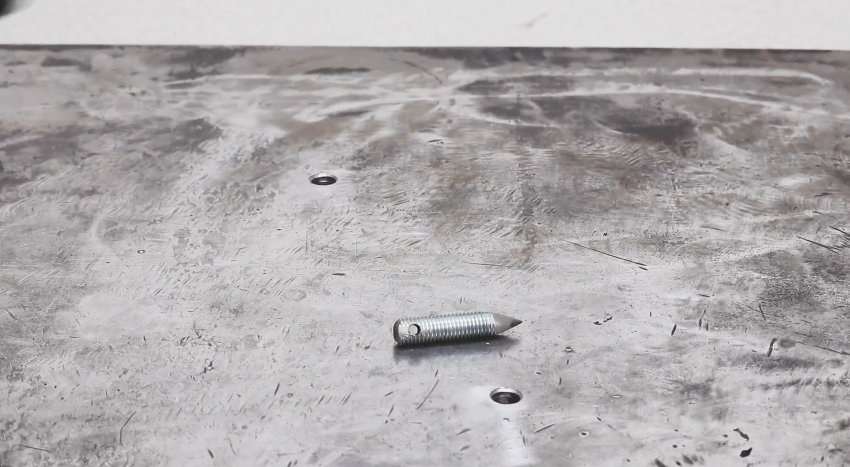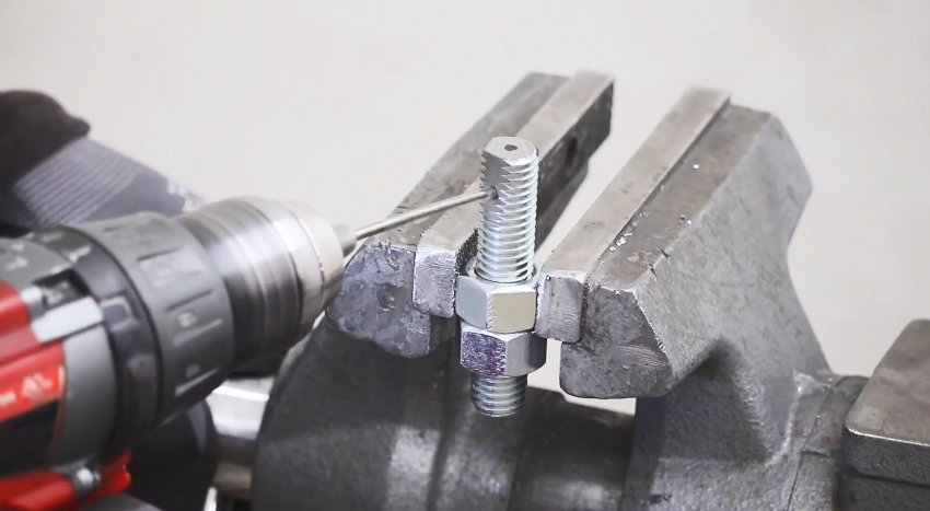 Игла циркуля делается из отрезка шпильки, соответствующей по диаметру внутренней обойме подшипника. С одного края ее нужно просверлить поперек и вдоль, чтобы свести отверстия. В продольном нарезается резьба.