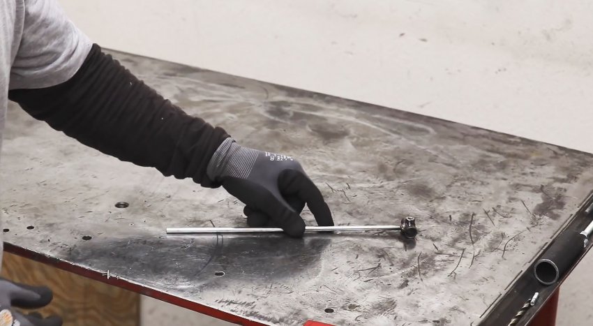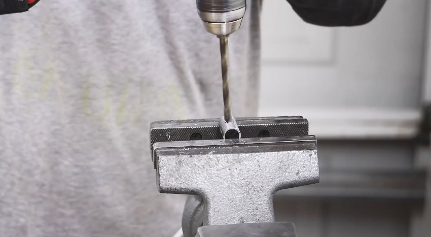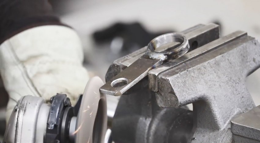 К нему приваривается отрезок полосы длиной 50 мм, с предварительно просверленным отверстием на конце сверлом 8-10 мм.