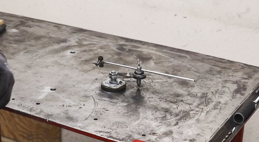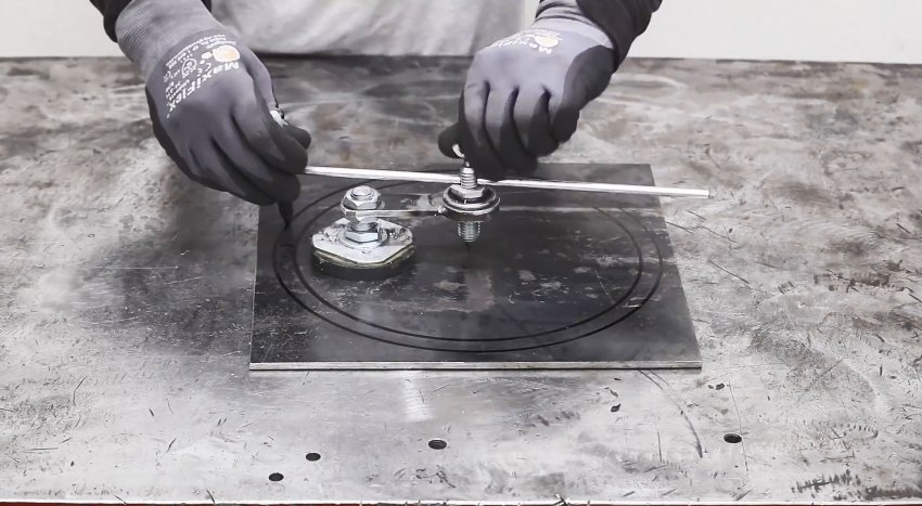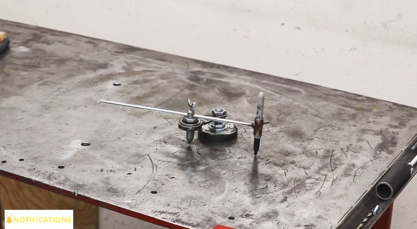 Теперь инструмент готов к примирению. Нужно прилепить магнит на поверхность так, чтобы игла разместилась на центральной точке черчения. Затем регулируем штангой радиус, и чертим круг.