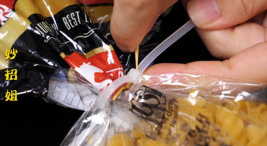 А чтобы потом открыть пакет, можно воспользоваться обычной зубочисткой, подогнув язычок фиксатора хомута и вытянув полоску.