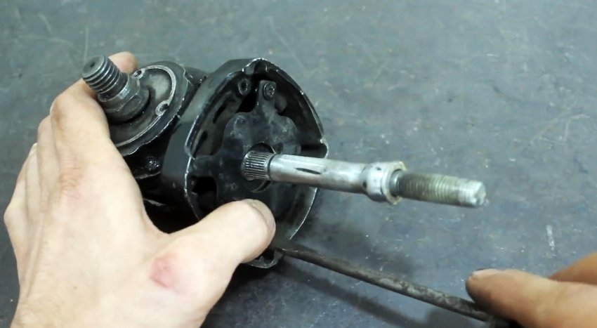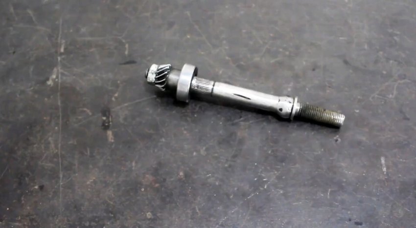 На доработанный вал напрессовывается подшипник, и прикручивается ранее снятая шестерня. Затем он устанавливается обратно в редуктор болгарки.