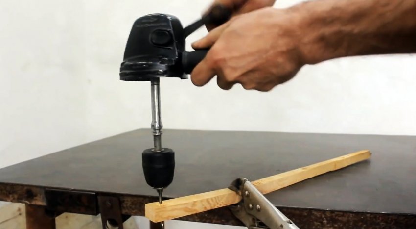 В результате получаем очень хорошую ручную дрель. За счет передаточного числа используемого редуктора, за один оборот ручки сверло делает от 2,5 до 4 оборотов, поэтому сверление происходит не так медленно, как может показаться.