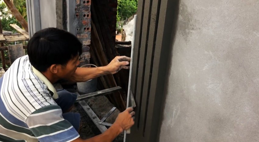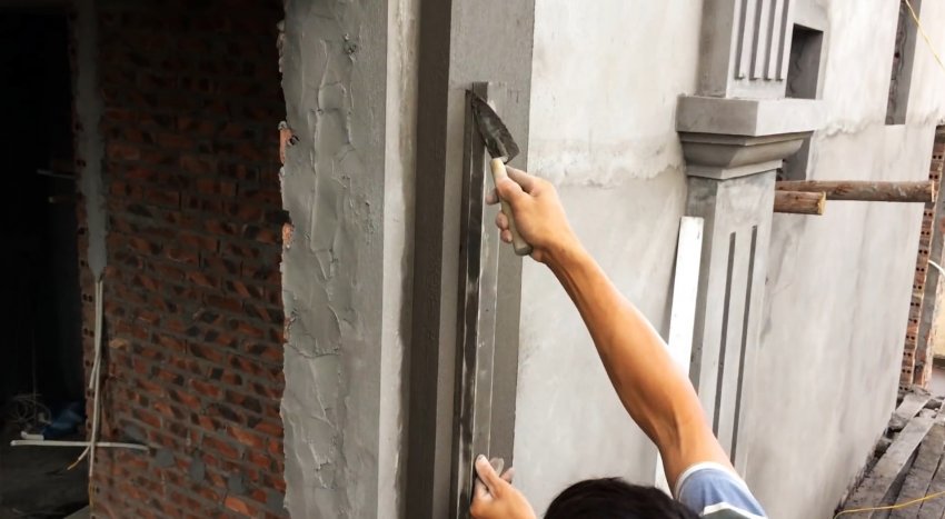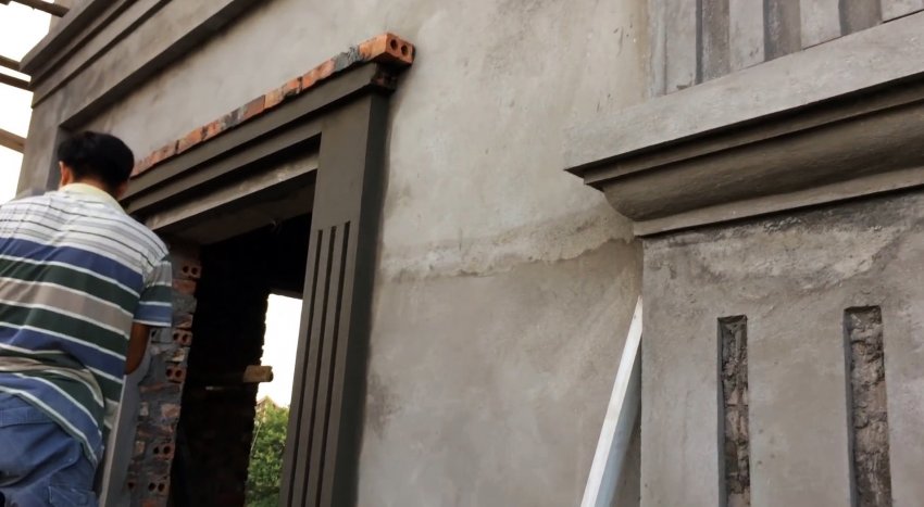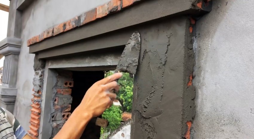 С улицы проемы дверей и окон можно отштукатурить цементным раствором. Такая отделка стоит очень дешево в плане затрат на материал, но позволяет просто преобразить фасад. Подобная работа на первый взгляд выглядит сложной, но с этим можно справиться своими силами, если действовать по проверенной схеме и правильно замешать штукатурку.