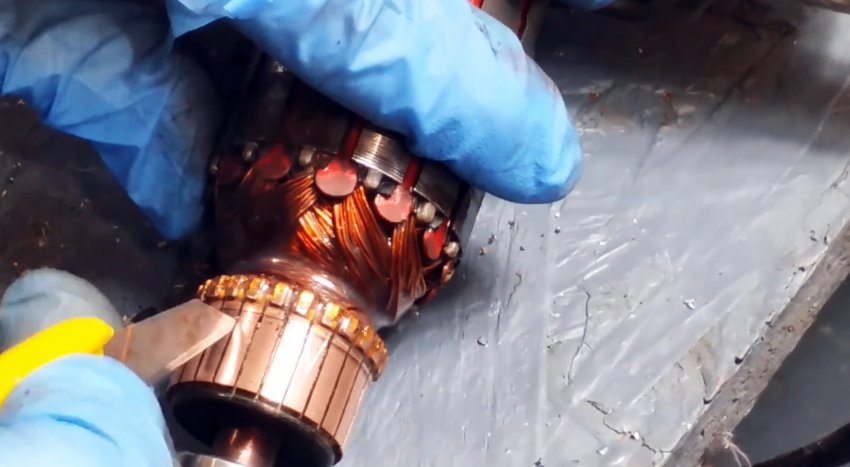 Далее нужно снять фаску с острых граней ламелей. Для этого между ними нужно провести пару раз уголком надфиля. Инструмент ведется плавным движением от намотки к краю ротора.