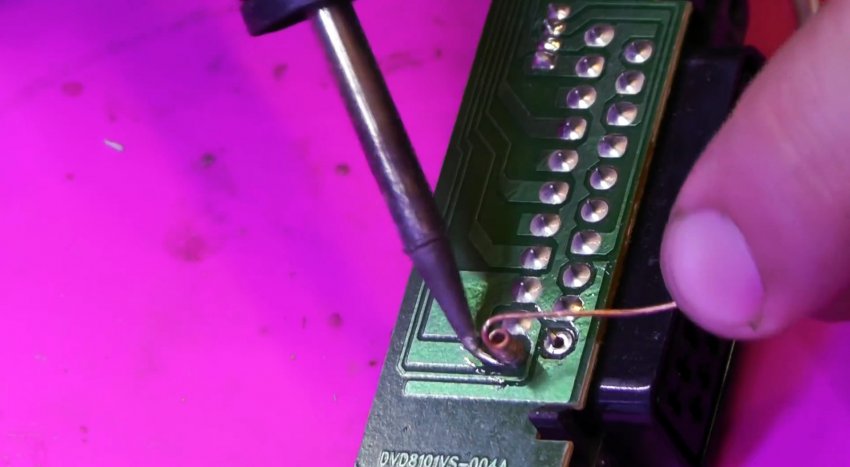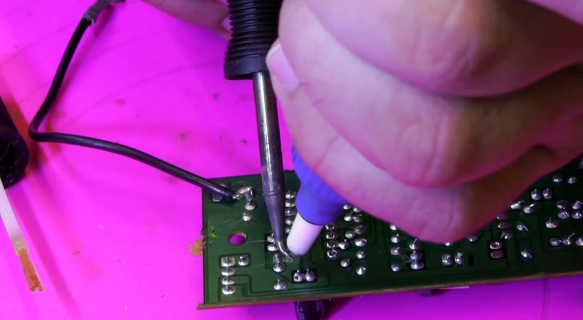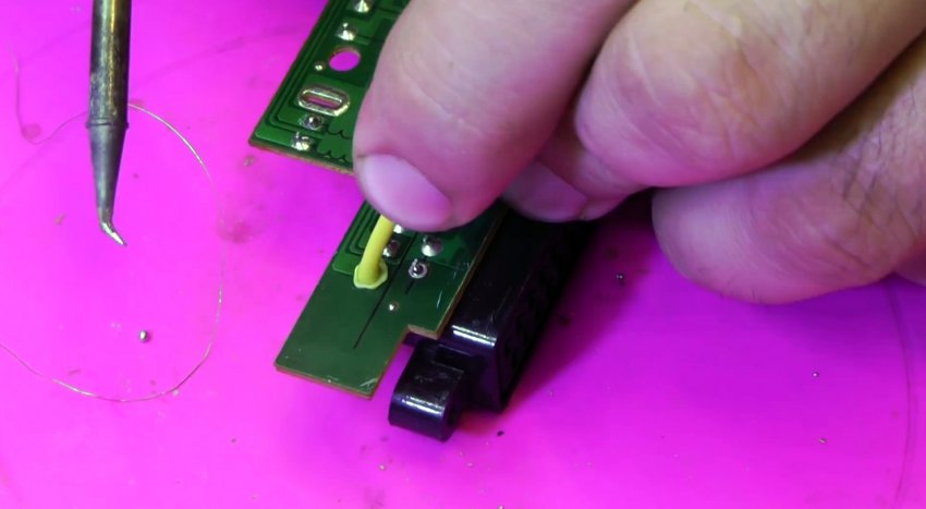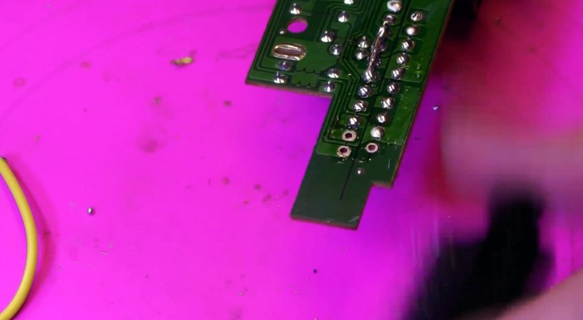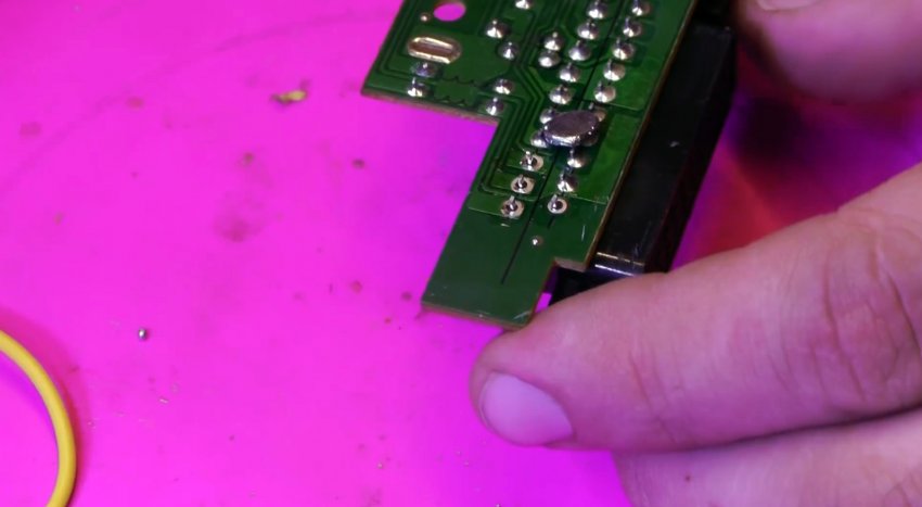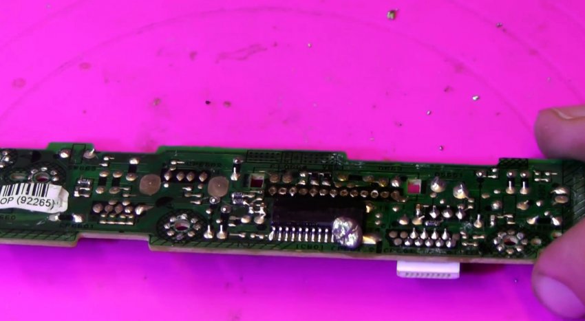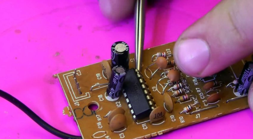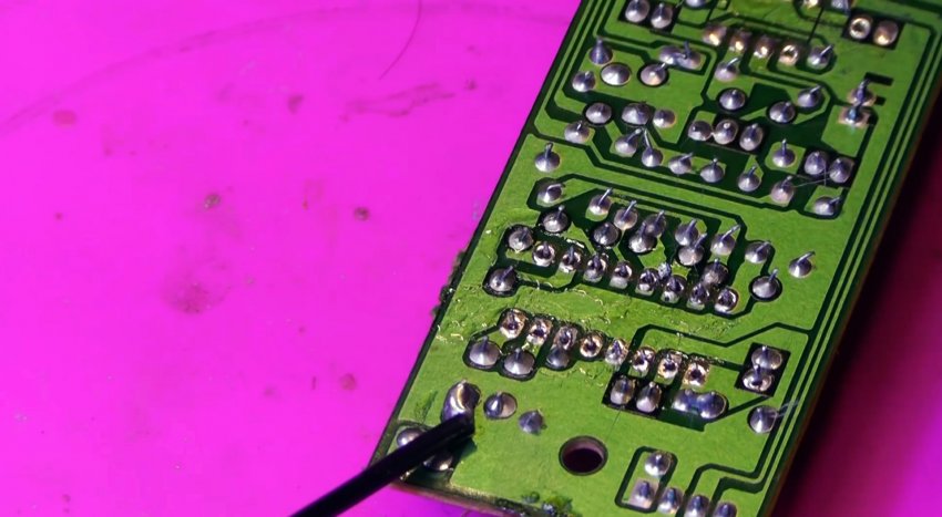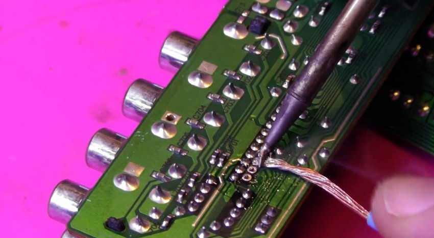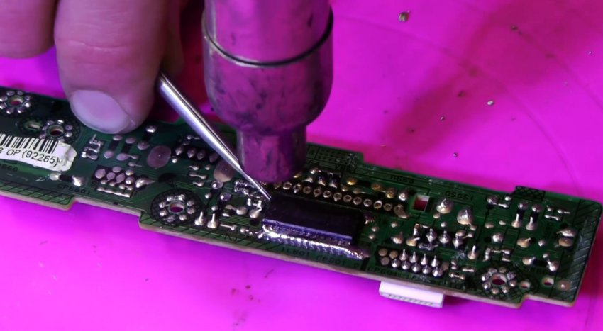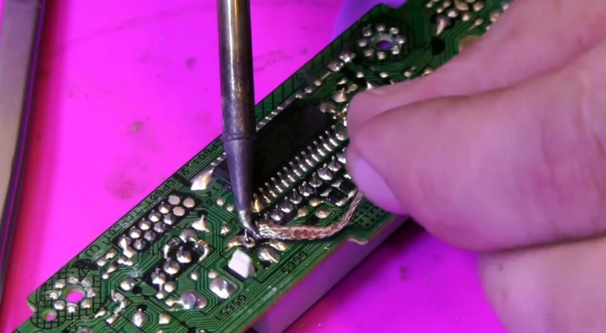 Выходы микросхемы можно разогреть паяльным феном и просто снять нужный компонент. Лучше всего в этот момент оттягивать его на обороте пинцетом. Это быстро и просто, но при использовании фена происходит перегрев платы.