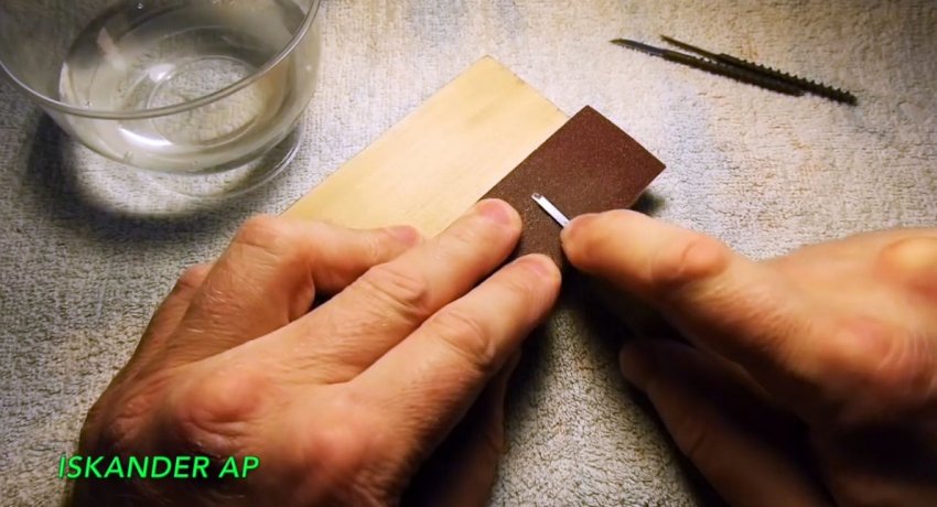 После грубой обработки на наждаке следует сделать финальную заточку на более мелких абразивах, можно наждачной бумаге уложенной на ровную поверхность. Резцы точатся возвратно-поступательными движениями с добавлением воды. Зернистость бумаги нужно понижать, пока инструмент не станет бритвенно-острым.