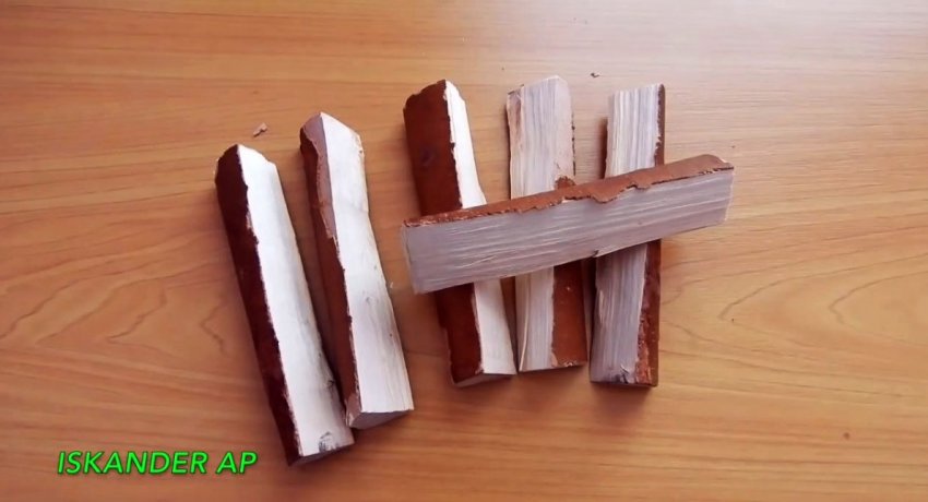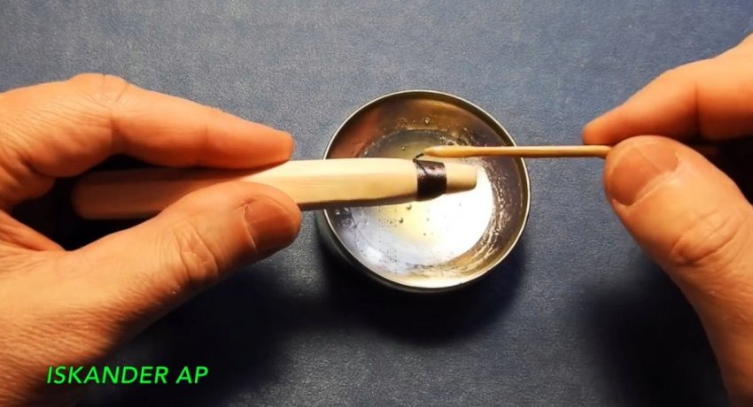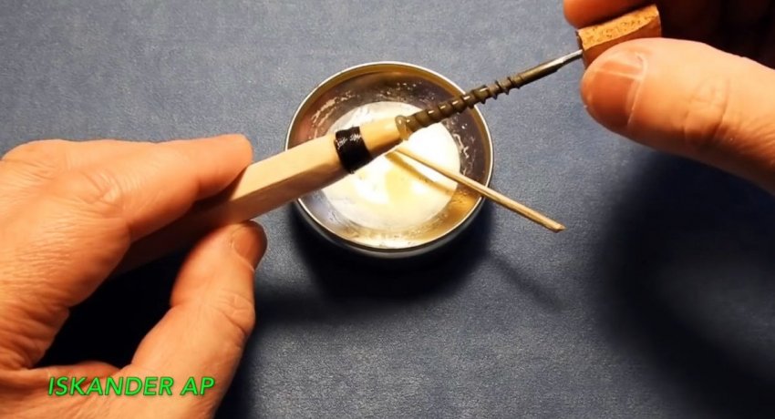 Далее они затачиваются. Для этого обрезанные саморезы вкручиваются в деревянный держатель. Это легко сделать, зажав их в патроне шуруповерта. Точить нужно с двух сторон, прижимая их к точильному диску параллельно, подпирая сбоку бруском. Раз в пару секунд заготовки следует охлаждать. Сначала выводятся спуски, потом делается односторонняя заточка самого резца.